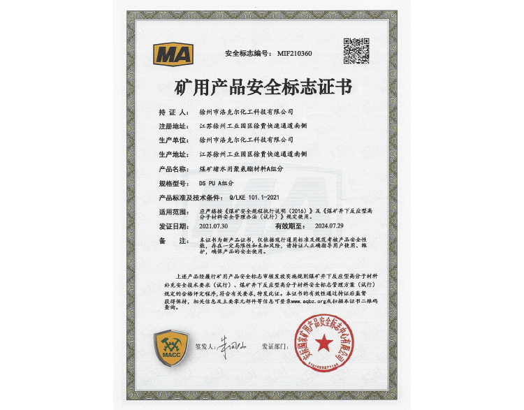 煤矿加固煤岩体用聚氨酯材料安标证书
